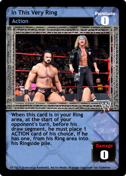 When this card is in your Ring area, at the start of your opponent's turn, before his draw segment, he must place 1 ACTION card of his choice, if he has one, from his Ring area into his Ringside pile.