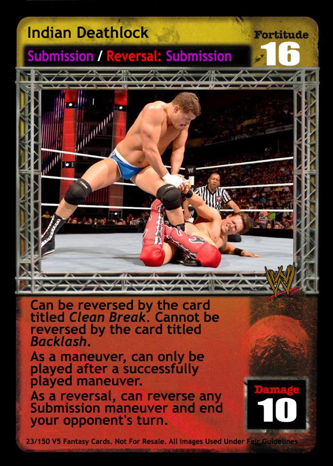 Can be reversed by the card titled Clean Break. Cannot be reversed by the card titled Backlash. As a maneuver, can only be played after a successfully played maneuver. As a reversal, can reverse any Submission maneuver and end your opponent's turn.