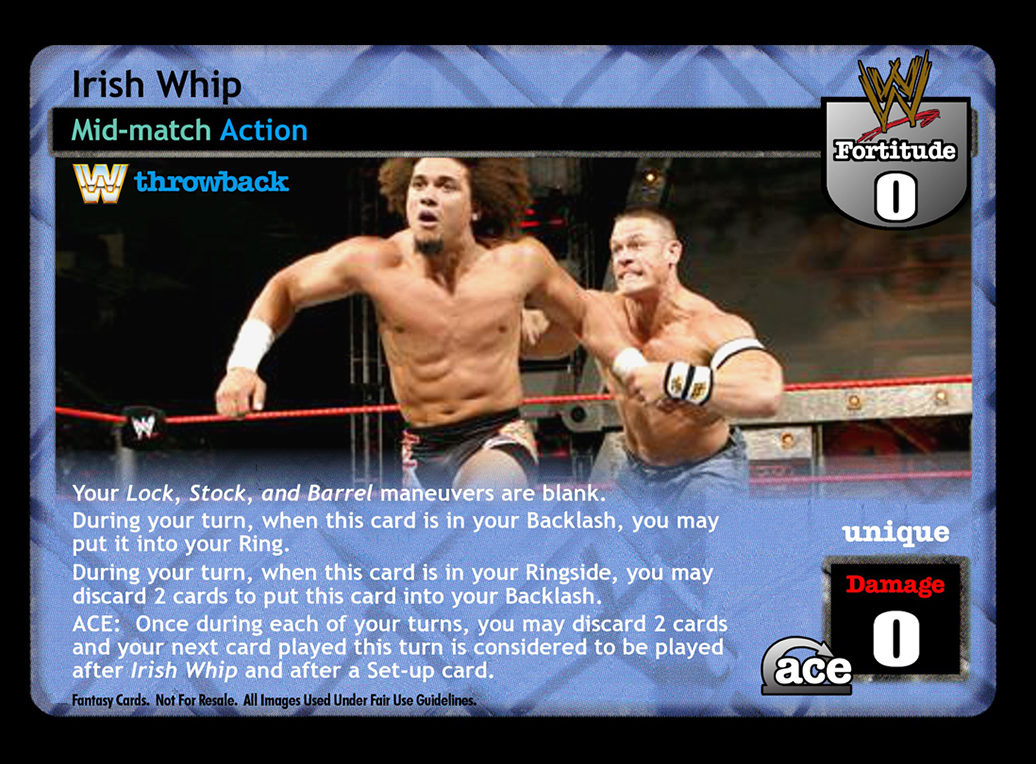 Your Lock, Stock, and Barrel maneuvers are blank. During your turn when this card is in your Backlash, you may put it into your Ring. During your turn when this card is in your Ringside, you may discard 2 cards and then put this card into your Backlash. ACE: Once during each of your turns, you may discard 2 cards and then your next card played this turn is considered to be played after Irish Whip and after a Set-up card.