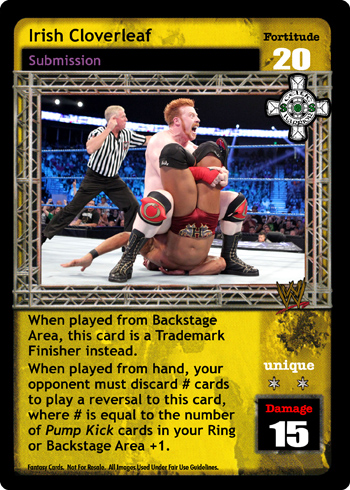 When played from Backstage Area, this card is a Trademark Finisher instead. When played from hand, your opponent must discard # cards to play a reversal to this card, where # is equal to the number of Pump Kick cards in your Ring or Backstage Area +1.