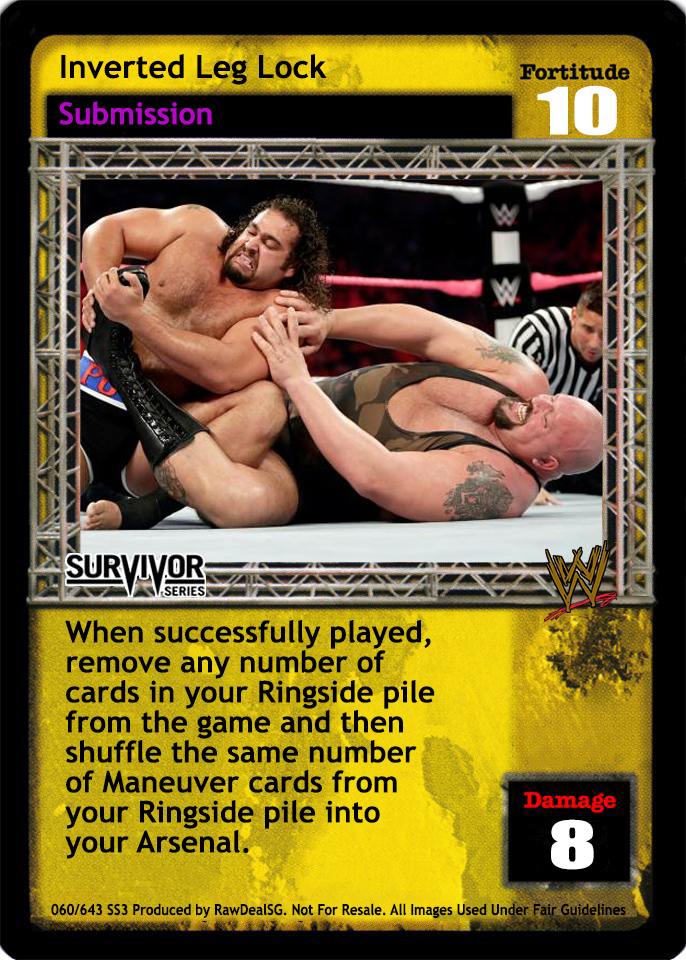 When successfully played, remove any number of cards in your Ringside pile from the game and shuffle the same number of Maneuver cards from your Ringside pile into your Arsenal.