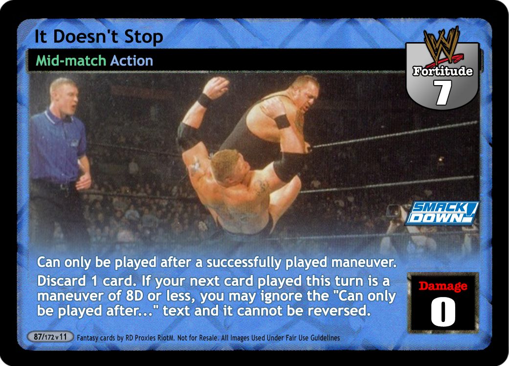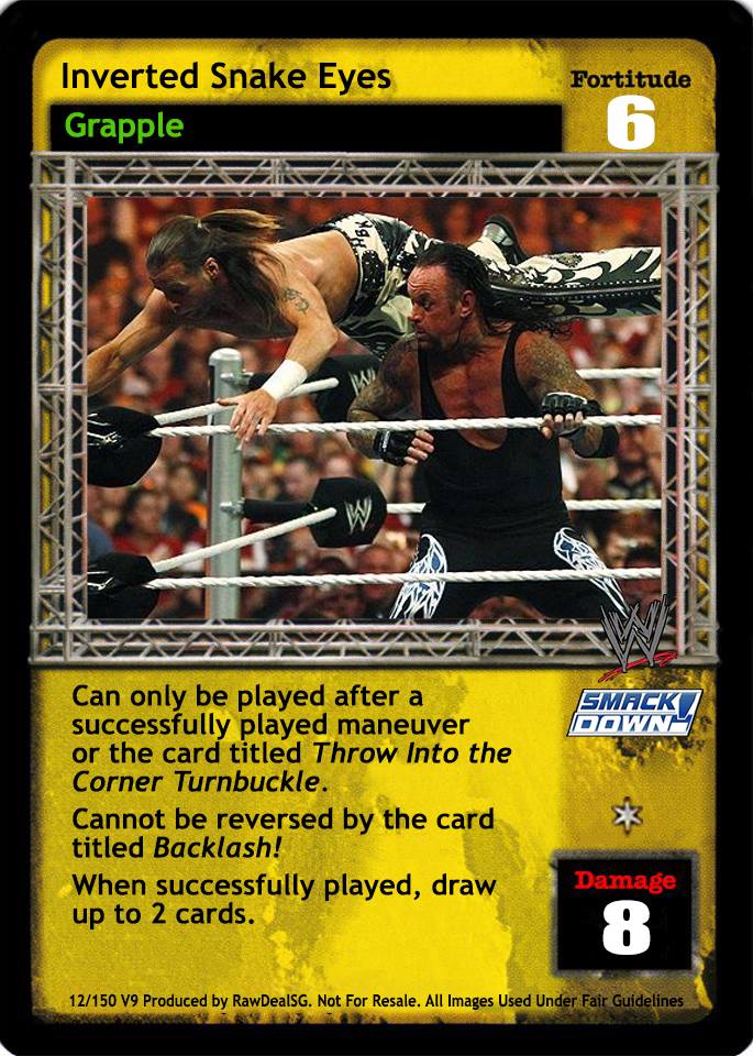 Can only be played after a successfully played maneuver or the card titled Throw Into the Corner Turnbuckle. Cannot be reversed by the card titled Backlash! When successfully played, draw up to 2 cards.