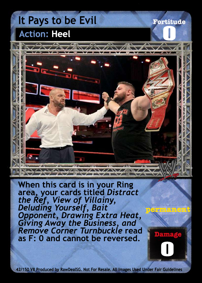 When this card is in your Ring area, your cards titled Distract the Ref, View of Villainy, Deluding Yourself, Bait Opponent, Drawing Extra Heat, Giving Away the Business, and Remove Corner Turnbuckle read as F: 0 and cannot be reversed.