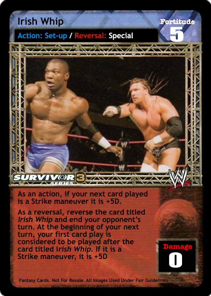 As an action, if your next card played this turn is a Strike maneuver, it is +5D. As a reversal, reverse the card titled Irish Whip and end your opponent's turn. At the beginning of your next turn, your first card played is considered to be played after the card titled Irish Whip. If it is a Strike maneuver, it is +5D.
