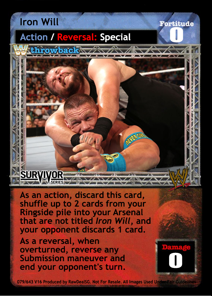 As an action, discard this card, shuffle up to 2 cards from your Ringside pile into your Arsenal that are not titled Iron Will, and your opponent discards 1 card. As a reversal, when overturned, reverse any Submission maneuver and end your opponent's turn.