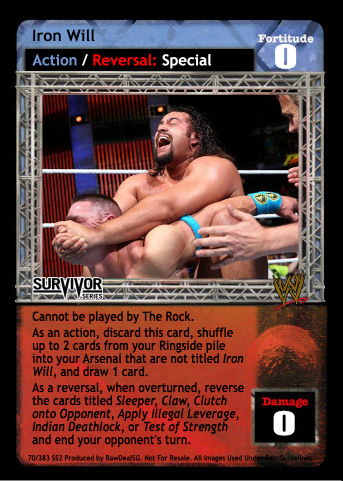 Cannot be played by The Rock. As an action, discard this card, shuffle up to 2 cards from your Ringside pile into your Arsenal that are not titled Iron Will, and draw 1 card. As a reversal, when overturned, reverse the cards titled Sleeper, Claw, Clutch onto Opponent, Apply Illegal Leverage, Indian Deathlock, or Test of Strength and end your opponent's turn.