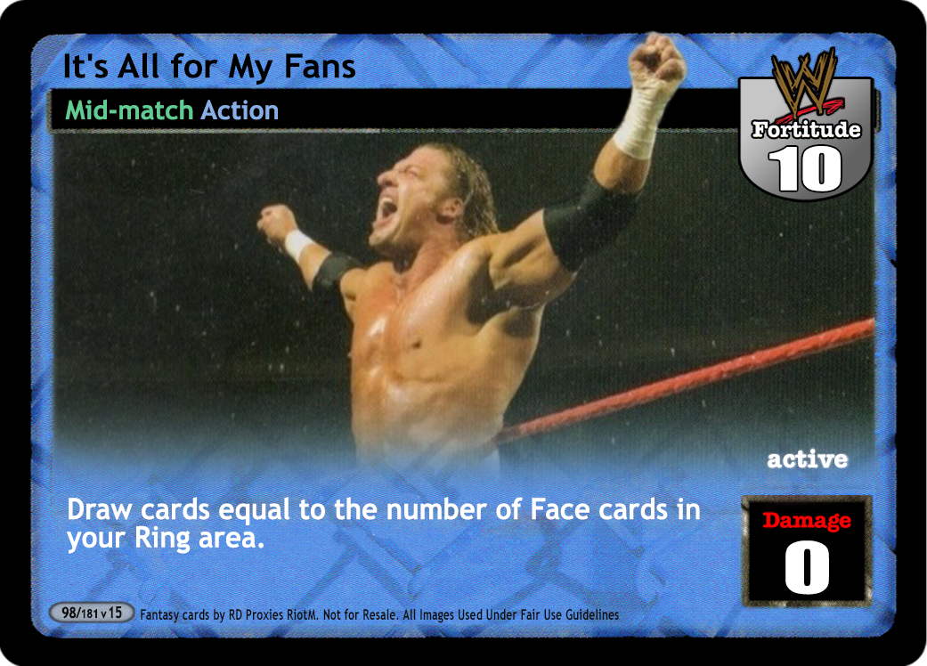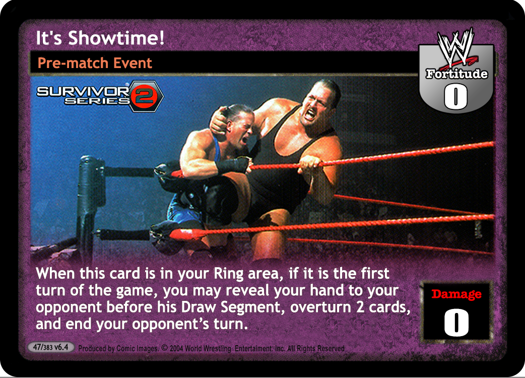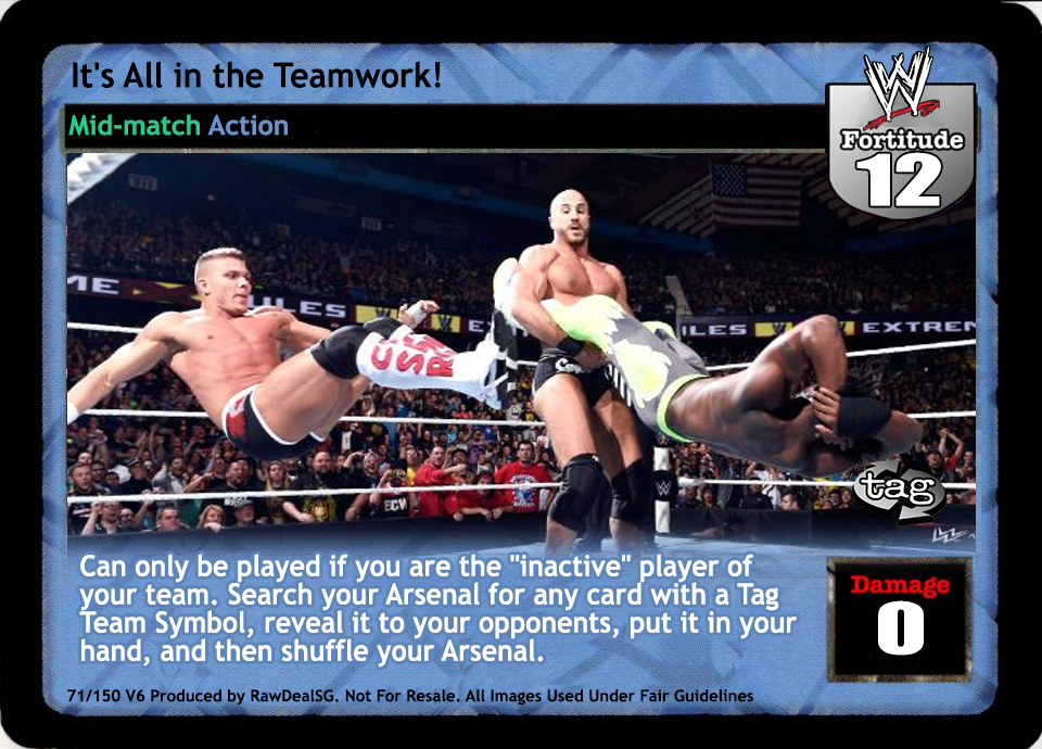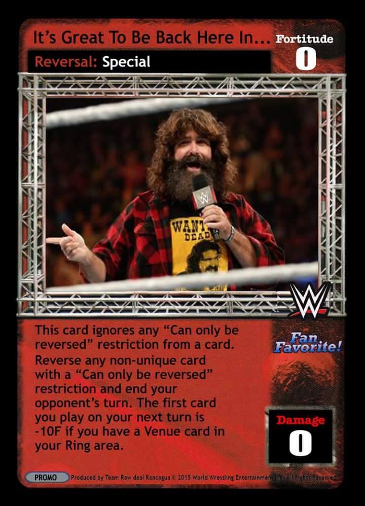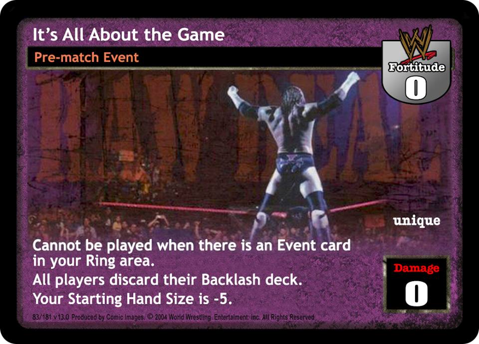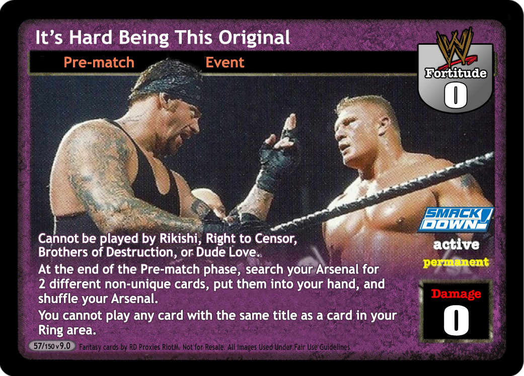 Cannot be played by Rikishi, Right to Censor, Brothers of Destruction, or Dude Love. At the end of the Pre-match phase, search your Arsenal for 2 different non-unique cards, put them into your hand, and shuffle your Arsenal. You cannot play any card with the same title as a card in your Ring area.