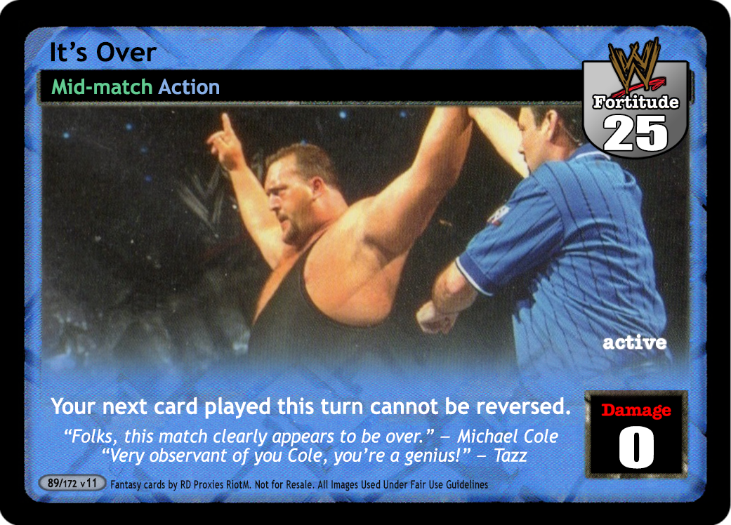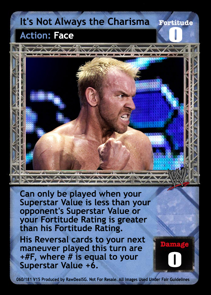 Can only be played when your Superstar Value is less than your opponent's Superstar Value or your Fortitude Rating is greater than his Fortitude Rating. His Reversal cards to your next maneuver played this turn are +#F, where # is equal to your Superstar Value +6.