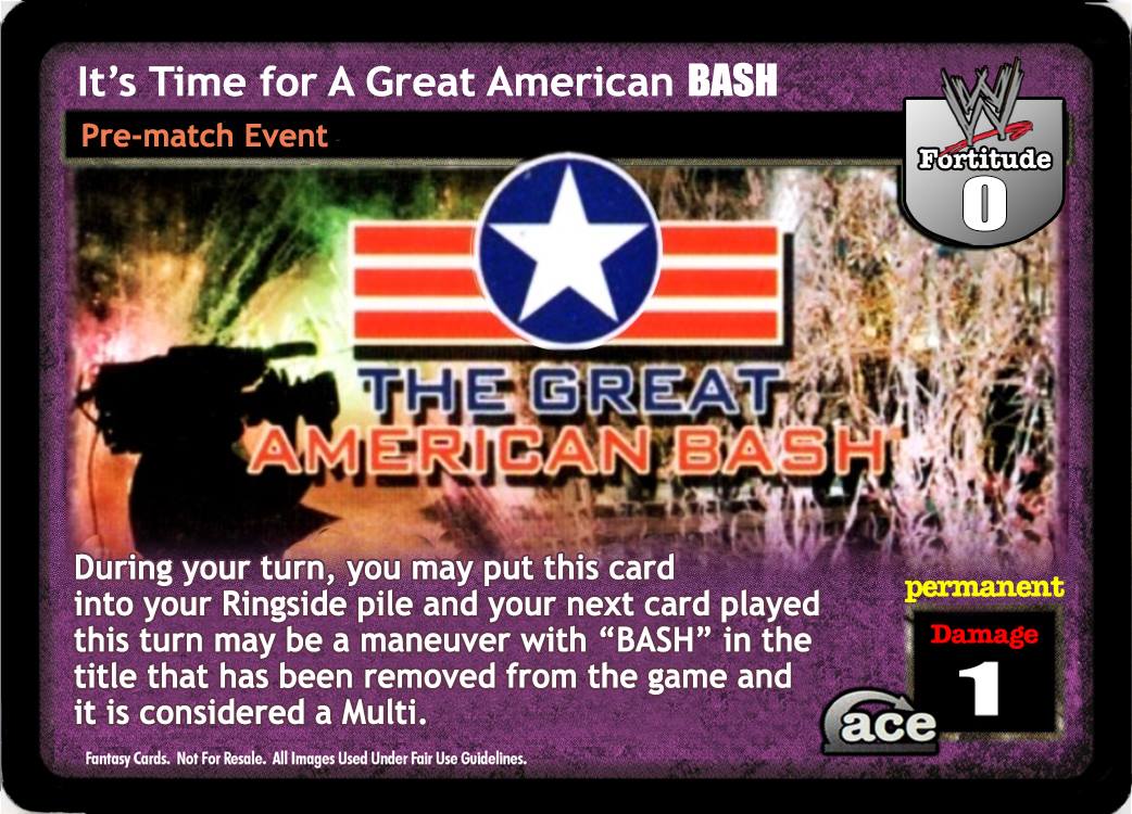 During your turn, you may put this card into your Ringside pile and your next card played this turn may be a maneuver with "BASH" in the title that has been removed from the game and it is considered a Multi.