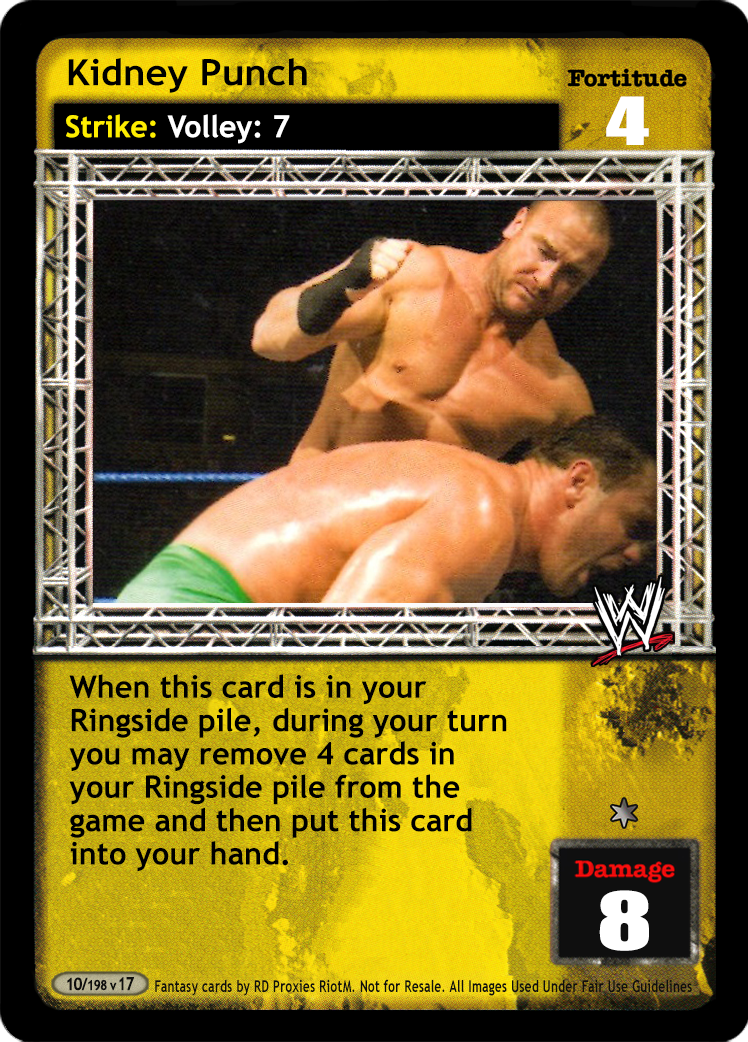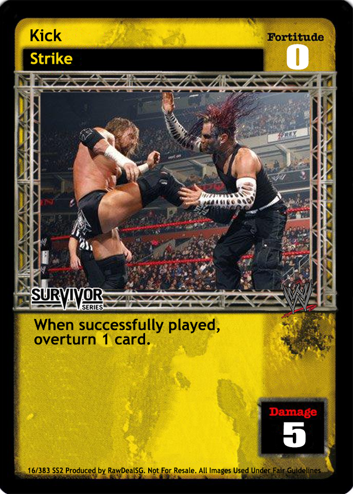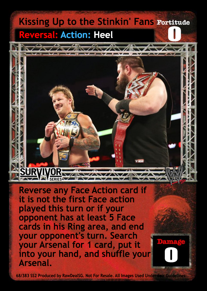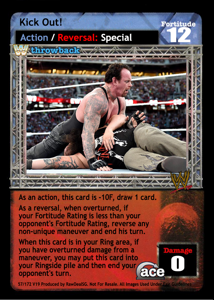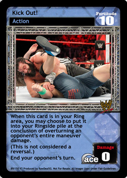 When this card is in your Ring area, you may choose to put it into your Ringside pile at the conclusion of overturning an opponent's entire maneuver damage. (This is not considered a reversal.) End your opponent's turn.