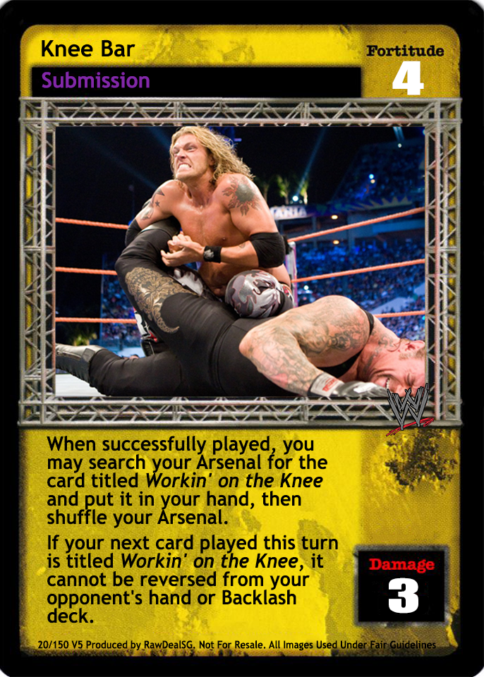 When successfully played, you may search your Arsenal for the card titled Workin' on the Knee and put it in your hand, then shuffle your Arsenal. If your next card played this turn is titled Workin' on the Knee, it cannot be reversed from your opponent's hand or Backlash deck.