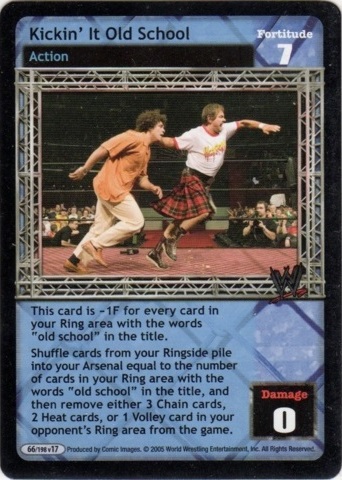 This card is -1F for every card in your Ring area with the words "old school" in the title. Shuffle cards from your Ringside pile into your Arsenal equal to the number of cards in your Ring area with the words "old school" in the title, and then remove either 3 Chain cards, 2 Heat cards, or 1 Volley card in your opponent's Ring area from the game.