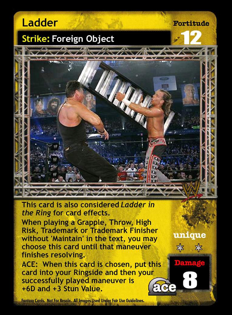 This card is also considered Ladder in the Ring for card effects. When playing an Extreme of printed 5D or greater, Grapple, Throw, High Risk, Trademark or Trademark Finisher without 'Maintain' in the text, you may choose this card until that maneuver finishes resolving. ACE: When this card is chosen, put this card into your Ringside and then your successfully played maneuver is +6D and +3 Stun Value.