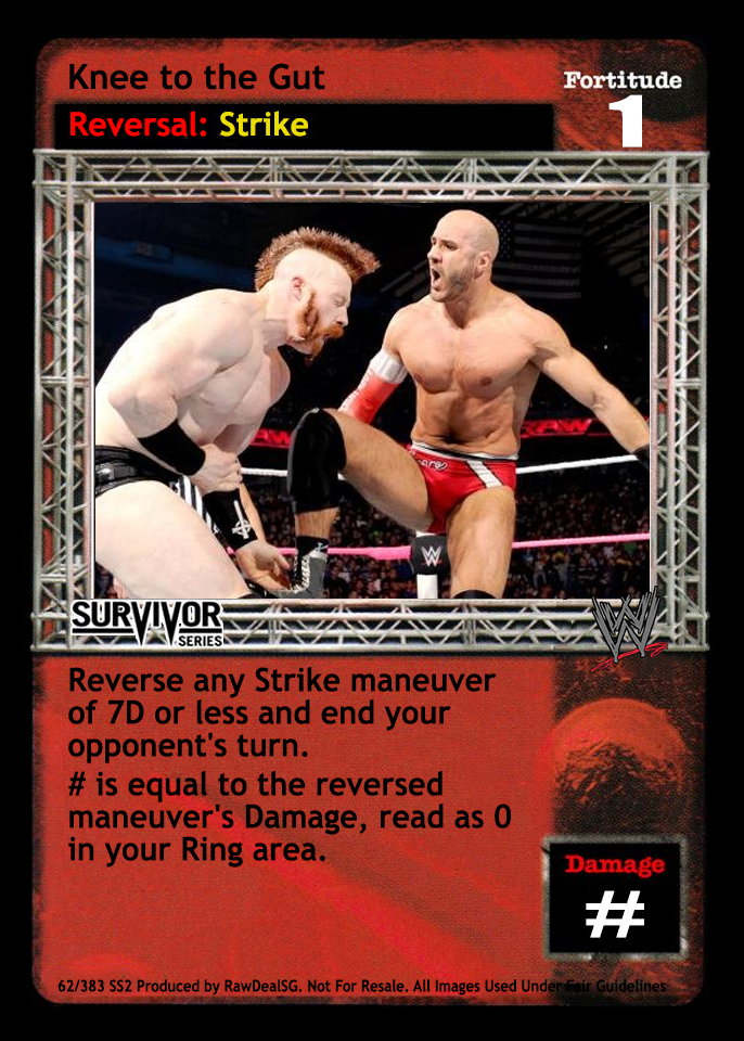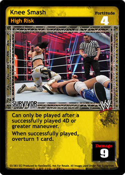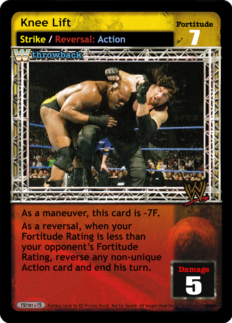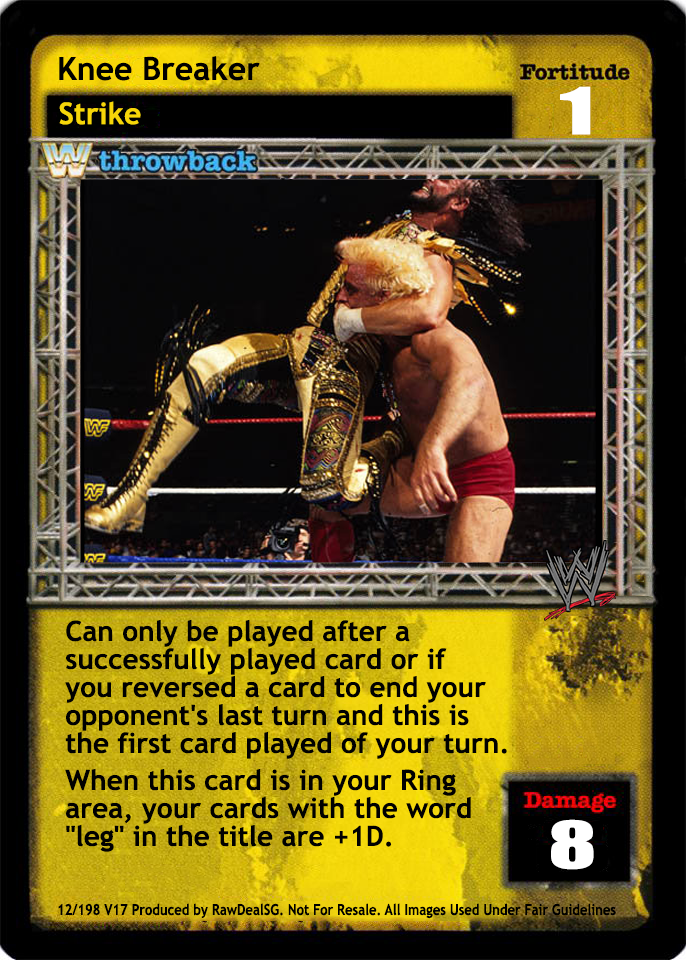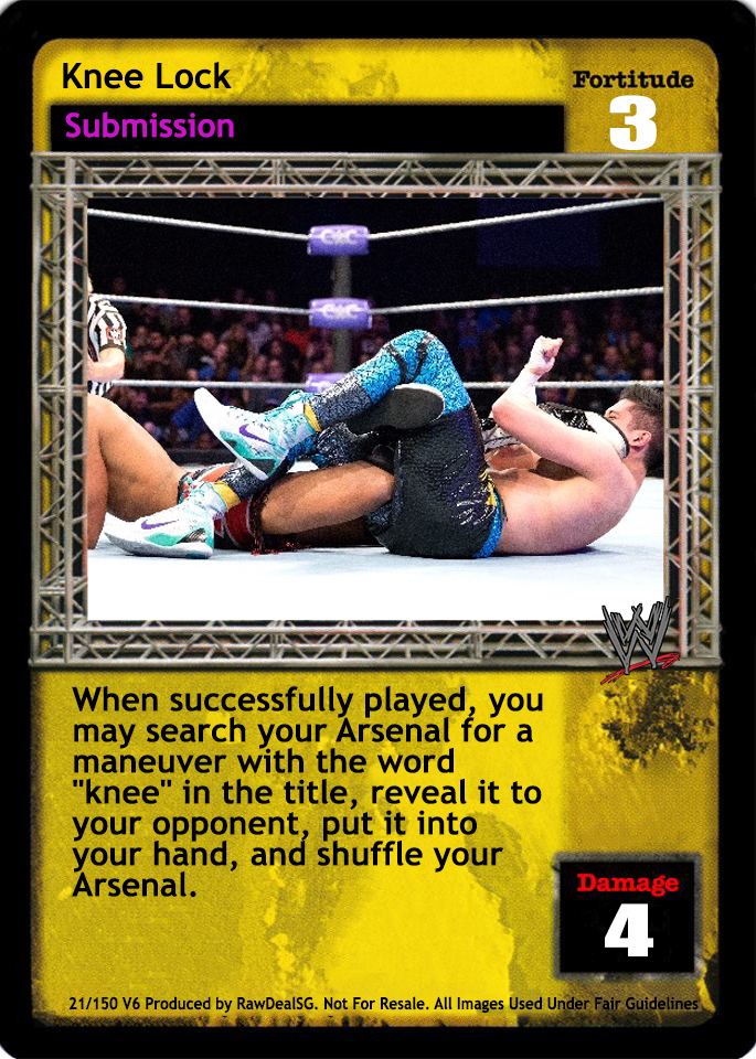 When successfully played, you may search your Arsenal for a maneuver with the word "knee" in the title, reveal it to your opponent, put it into your hand, and shuffle your Arsenal.