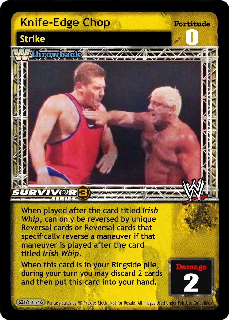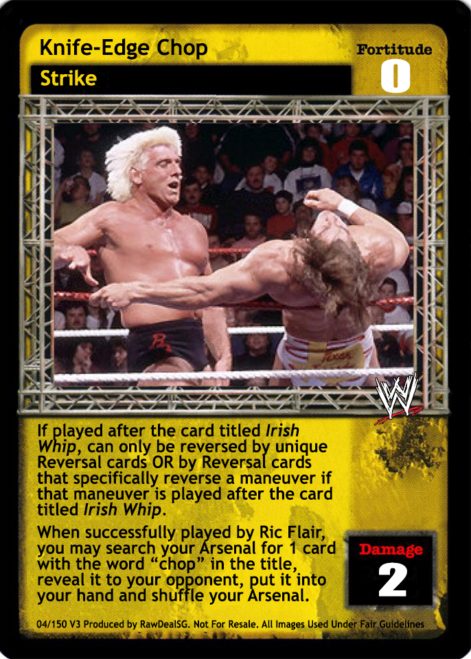 If played after the card titled Irish Whip, can only be reversed by unique Reversal cards OR by Reversal cards that specifically reverse a maneuver if that maneuver is played after the card titled Irish Whip. When successfully played by Ric Flair, you may search your Arsenal for 1 card with the word "chop" in the title, reveal it to your opponent, put it into your hand, and shuffle your Arsenal.
