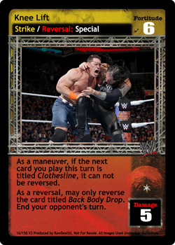 As a maneuver, if the next card you play this turn is titled Clothesline, it can not be reversed. As a reversal, may only reverse the card titled Back Body Drop. End your opponent's turn.