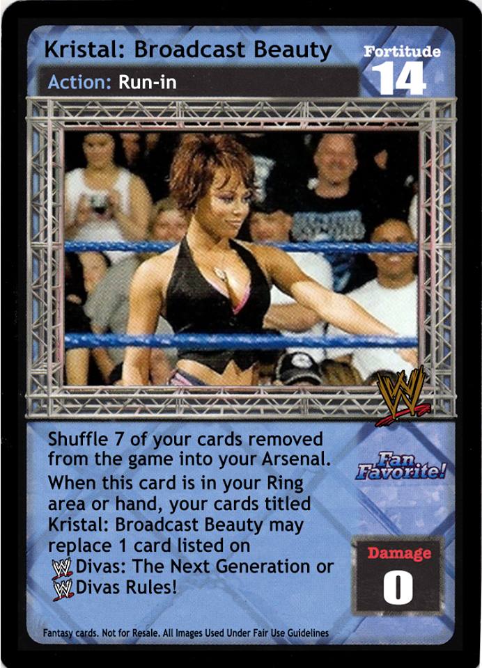 Shuffle 7 of your cards removed from the game into your Arsenal. When this card is in your Ring area or hand, your cards titled Kristal: Broadcast Beauty may replace 1 card listed on <WWE logo> Divas: The Next Generation or <WWE logo> Divas Rule!