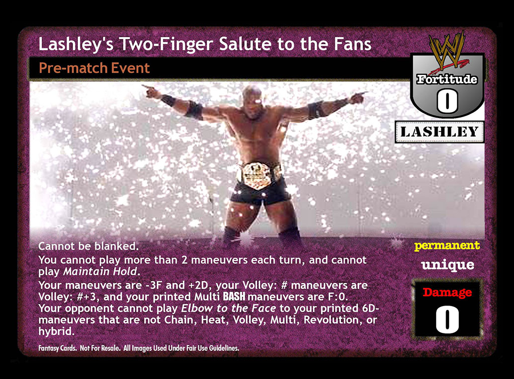 Cannot be blanked. You cannot play more than 2 maneuvers each turn, and you cannot play Maintain Hold. Your maneuvers are -3F and +2D, your Volley: # maneuvers are Volley: #+3, and your printed Multi BASH maneuvers are F:0. Your opponent cannot play Elbow to the Face to your printed 6D- maneuvers that are not Chain, Heat, Volley, Multi, Revolution, or hybrid.