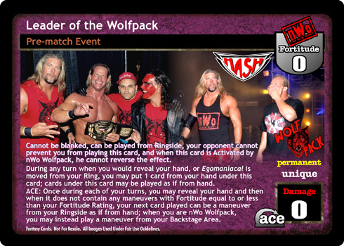 Cannot be blanked, can be played from Ringside, your opponent cannot prevent you from playing this card, and when this card is Activated by nWo Wolfpack, he cannot reverse the effect. During any turn when you would reveal your hand, or Egomaniacial is moved from your Ring, you may put 1 card from your hand under this card; cards under this card may be played as if from hand. ACE: Once during each of your turns, you may reveal your hand and then when it does not contain any maneuvers with printed Fortitude equal to or less than your Fortitude Rating, your next card played can be a maneuver from your Ringside as if from hand; when you are nWo Wolfpack, you may instead play a maneuver from your Backstage Area.