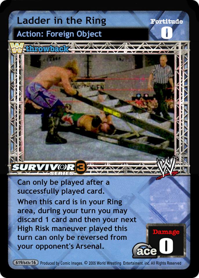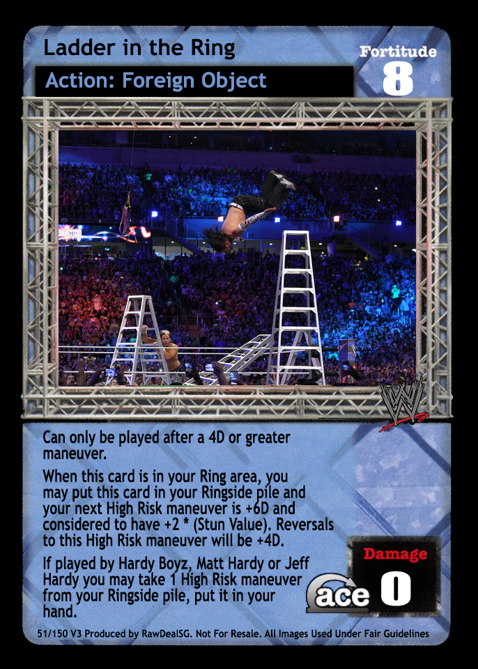 Can only be played after a 4D or greater maneuver. When this card is in your Ring area, you may put this card in your Ringside pile and your next High Risk maneuver is +6D and considered to have +2 * (Stun Value). Reversals to this High Risk maneuver will be +4D. If played by Hardy Boyz, Matt Hardy or Jeff Hardy you may take 1 High Risk maneuver from your Ringside pile, put it in your hand.
