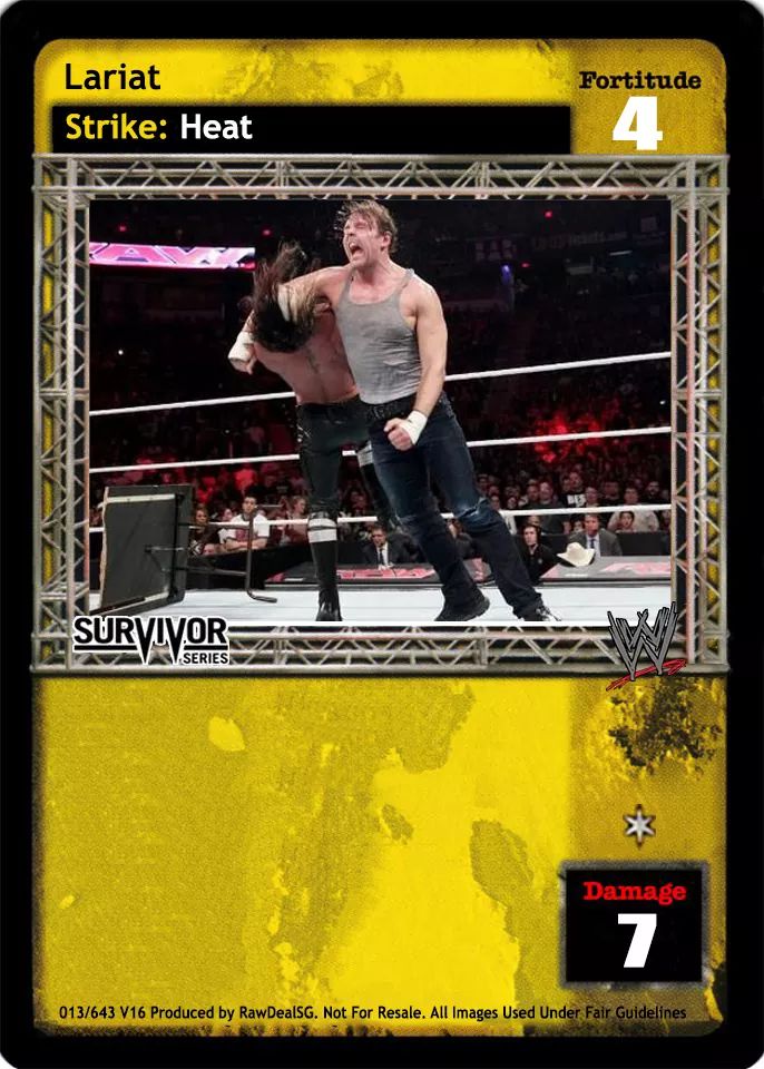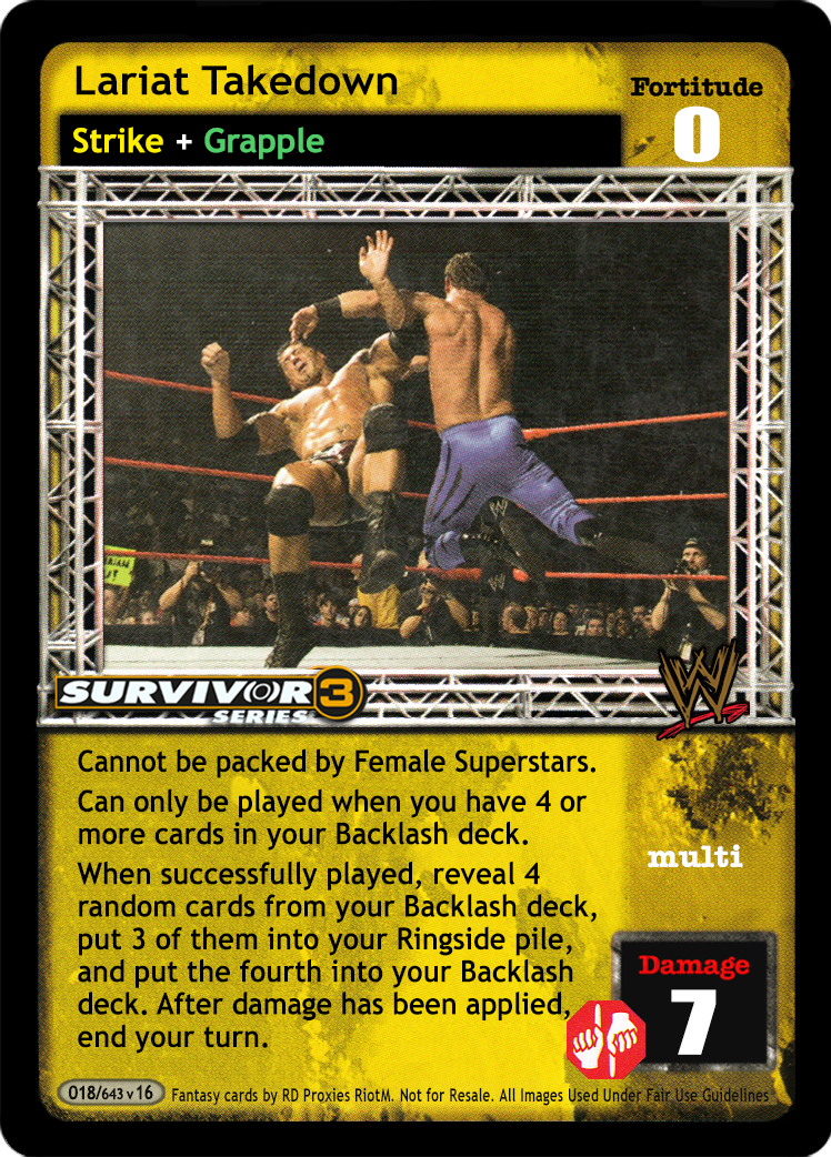 Cannot be packed by Female Superstars. Can only be played when you have 4 or more cards in your Backlash deck. When successfully played, reveal 4 random cards from your Backlash deck, put 3 of them into your Ringside pile, and put the fourth into your Backlash deck. After damage has been applied, end your turn.