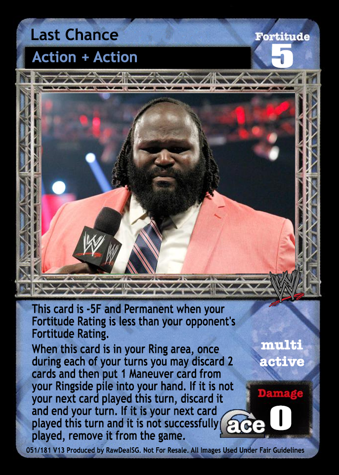 This card is -5F and Permanent when your Fortitude Rating is less than your opponent's Fortitude Rating. When this card is in your Ring area, once during each of your turns you may discard 2 cards and then put 1 Maneuver card from your Ringside pile into your hand. If it is not your next card played this turn, discard it and end your turn. If it is your next card played this turn and it is not successfully played, remove it from the game.