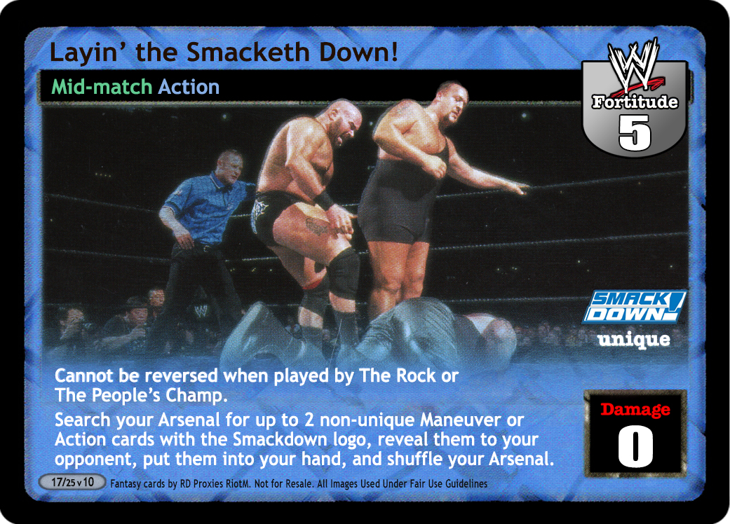 Cannot be reversed when played by The Rock or The People's Champ. Search your Arsenal for up to 2 non-unique Maneuver or Action cards with the Smackdown logo, reveal them to your opponent, put them into your hand, and shuffle your Arsenal.