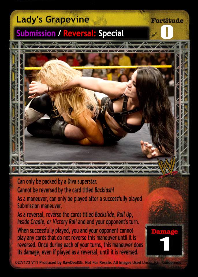 Can only be packed by a Diva superstar. Cannot be reversed by the card titled Backlash! As a maneuver, can only be played after a successfully played Submission maneuver. As a reversal, reverse the cards titled Backslide, Roll Up, Inside Cradle, or Victory Roll and end your opponent's turn. When successfully played, you and your opponent cannot play any cards that do not reverse this maneuver until it is reversed. Once during each of your turns, this maneuver does its damage, even if played as a reversal, until it is reversed.