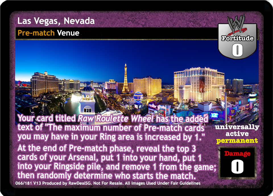 Your card titled Raw Roulette Wheel has the added text of "The maximum number of Pre-match cards you may have in your Ring area is increased by 1." At the end of Pre-match phase, reveal the top 3 cards of your Arsenal, put 1 into your hand, put 1 into your Ringside pile, and remove 1 from the game; then randomly determine who starts the match.