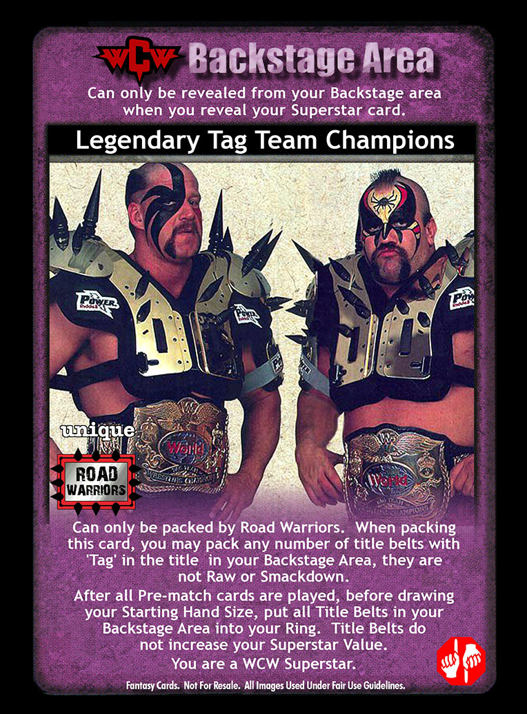 Can only be packed by Road Warriors. When packing this card, you may pack any number of title belts with 'Tag' in your Backstage Area, they are not Raw or Smackdown. After all Pre-match cards are played, before drawing your Starting Hand Size, put all Title Belts in your Backstage Area into your Ring. Title Belts do not increase your Superstar Value. You are a WCW Superstar.