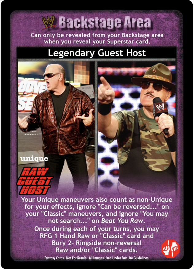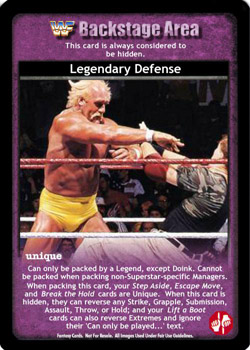 This card is always considered to be hidden. Can only be packed by a Legend, except Doink. Cannot be packed when packing non-Superstar-specific Managers. When packing this card, your Step Aside, Escape Move, and Break the Hold cards are Unique. When this card is hidden, they can reverse any Strike, Grapple, Submission, Assault, Throw, or Hold; and your Lift a Boot cards can also reverse Extremes and ignore their 'Can only be played...' text.