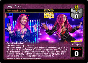 Cannot be blanked. Your Pre-match Capacity is +2. When you completely reverse your opponent's maneuver, put up to 1 non-hybrid maneuver that is Sasha Banks-specific or has 'back' in the title from your Ringside into your hand; when you have equal or lower Fortitude, and that card is your next card played, it is now Multi and ignore 'completely' on reversals to it.