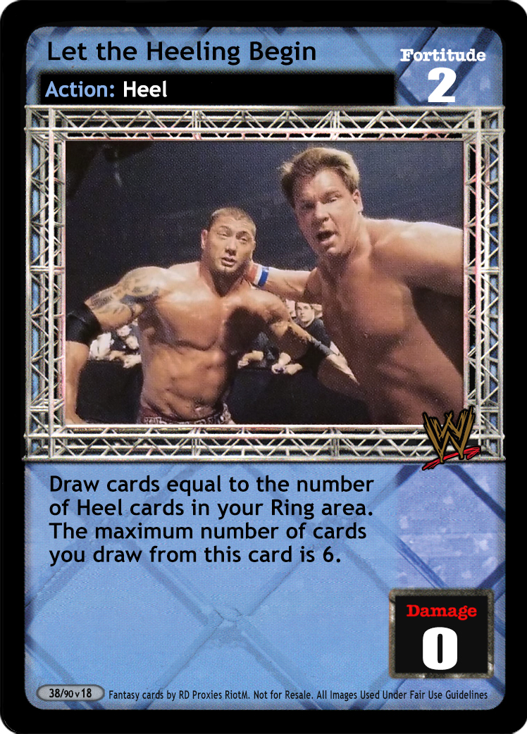 Draw cards equal to the number of Heel cards in your Ring area. The maximum number of cards you draw from this card is 6.