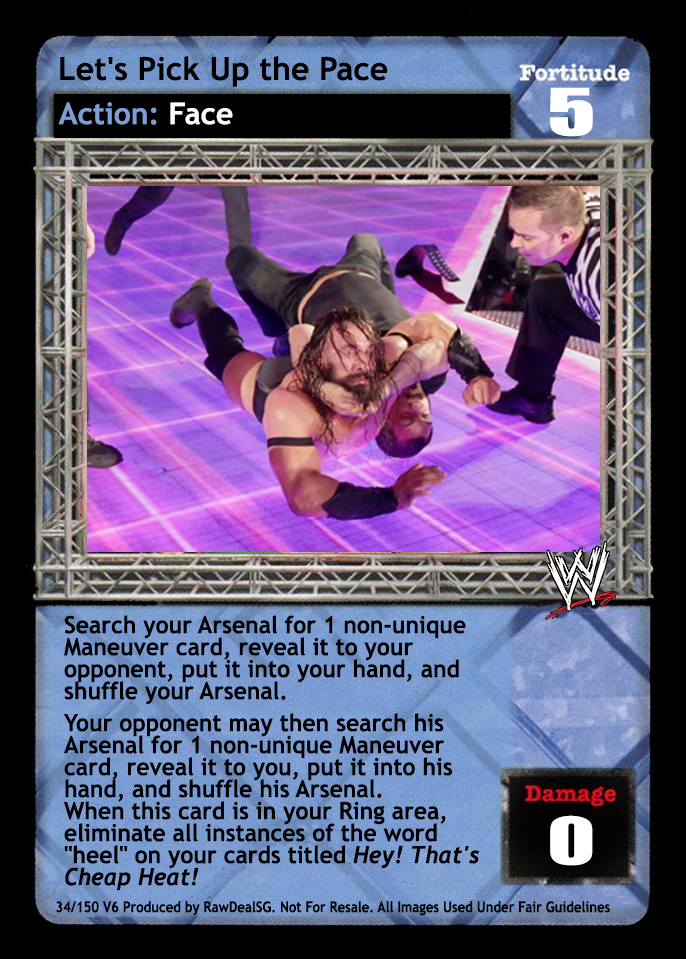 Search your Arsenal for 1 non-unique Maneuver card, reveal it to your opponent, put it into your hand, and shuffle your Arsenal. Your opponent may then search his Arsenal for 1 non-unique Maneuver card, reveal it to you, put it into his hand, and shuffle his Arsenal. When this card is in your Ring area, eliminate all instances of the word "heel" on your cards titled Hey! That's Cheap Heat!