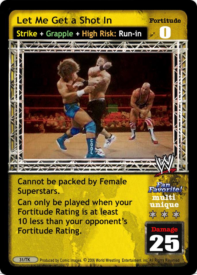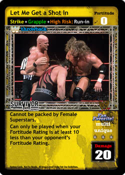 Cannot be packed by Female Superstars. Can only be played when your Fortitude Rating is at least 10 less than your opponent's Fortitude Rating.