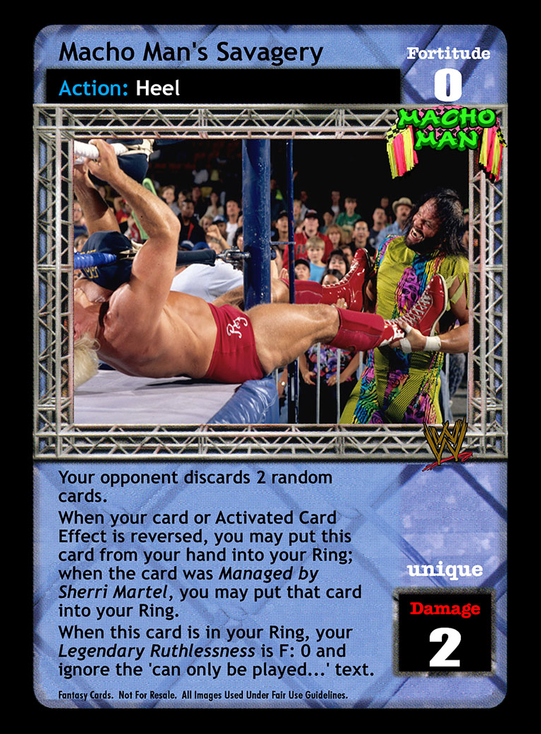 Your opponent discards 2 random cards. When your card or Activated Card Effect is reversed, you may put this card from your hand into your Ring; when the card was Managed by Sherri Martel, you may put that card into your Ring. When this card is in your Ring, your Legendary Ruthlessness is F: 0 and ignore the 'can only be played...' text.