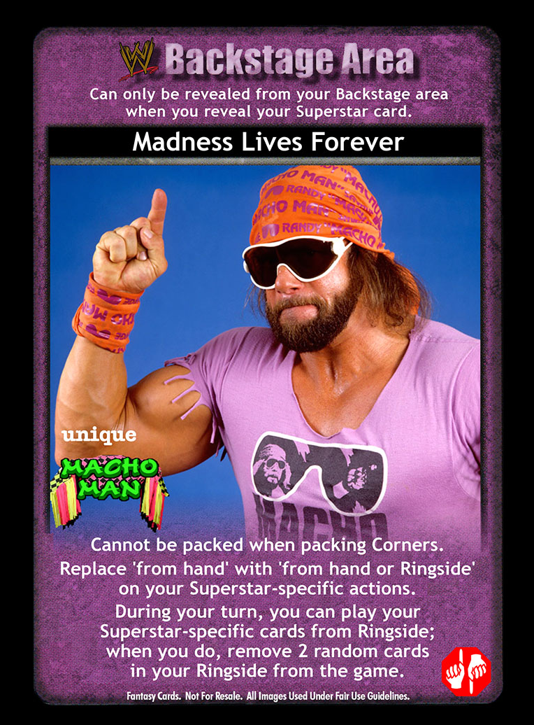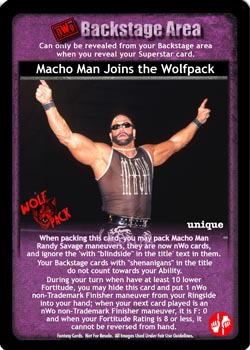 When packing this card, you may pack Macho Man Randy Savage maneuvers, they are now nWo cards, and ignore the 'with 'blindside' in the title' text in them. Your Backstage cards with 'shenanigans' in the title do not count towards your Ability. During your turn when you have at least 10 lower Fortitude, you may hide this card and put 1 nWo non-Trademark Finisher maneuver from your Ringside into your hand; when your next card played is an nWo non-Trademark Finisher maneuver, it is F: 0 and when your Fortitude Rating is 8 or less, it cannot be reversed from hand.