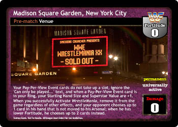 Your Pay-Per-View Event cards do not take up a slot, ignore the 'Can only be played...' text, and when a Pay-Per-View Event card is in your Ring, your Starting Hand Size and Superstar Value are +1. When you successfully Activate WrestleMania, remove it from the game regardless of other effects, and your opponent chooses up to 1 card in his hand that is not moved to his Arsenal; when he has lower Fortitude, he chooses up to 2 cards instead.