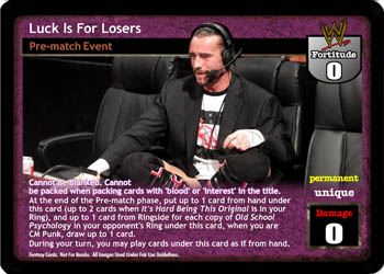 Cannot be blanked. Cannot be packed when packing cards with 'blood' or 'interest' in the title. At the end of the Pre-match phase, put up to 1 card from hand under this card (up to 2 cards when It's Hard Being This Original is in your Ring), and up to 1 card from Ringside for each copy of Old School Psychology in your opponent's Ring under this card, when you are CM Punk, draw up to 1 card. During your turn, you may play cards under this card as if from hand.