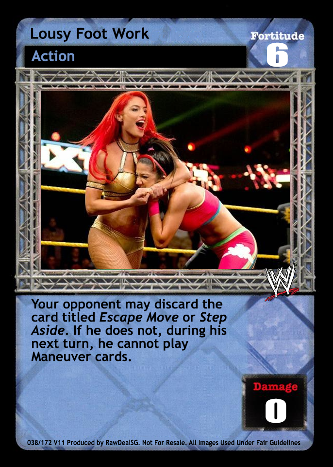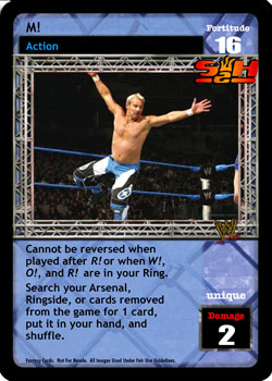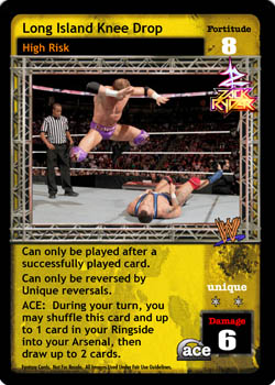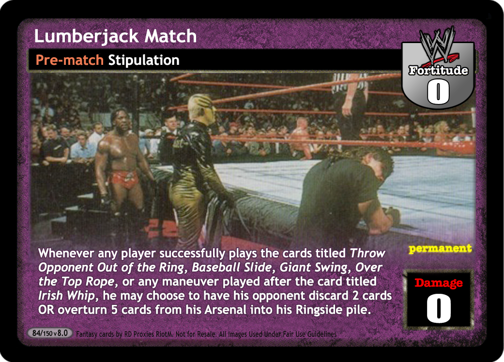 Whenever any player successfully plays the cards titled Throw Opponent Out of the Ring, Baseball Slide, Giant Swing, Over the Top Rope, or any maneuver played after the card titled Irish Whip, he may choose to have his opponent discard 2 cards OR overturn 5 cards from his Arsenal into his Ringside pile.