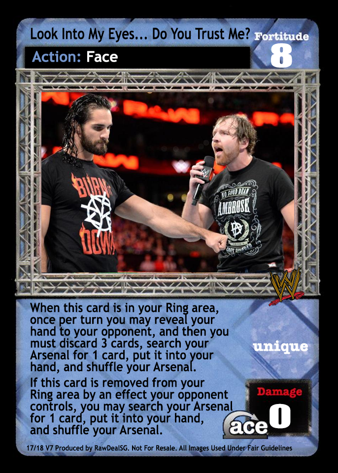 Can only be played after a successfully played card. Can only be reversed by Unique reversals. ACE: During your turn, you may shuffle this card and up to 1 card in your Ringside into your Arsenal, then draw up to 2 cards.