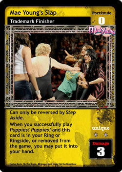 Can only be packed by a Legend Superstar. When this card is in your Ring area, you may put this card into your Ringside pile to completely reverse any non-unique maneuver and end your opponent's turn. When this card is in your Ringside pile, you may remove this card from the game to reverse any non-unique maneuver and end your opponent's turn.