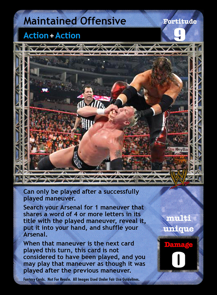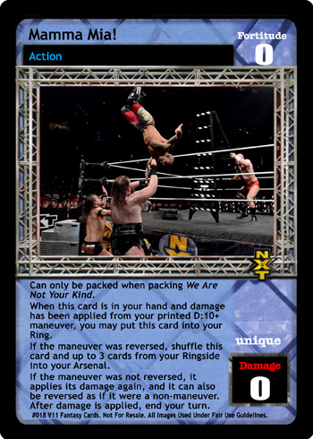 Can only be packed when packing We Are Not Your Kind. When this card is in your hand and damage has been applied from your printed D:10+ maneuver, you may put this card into your Ring. If the maneuver was reversed, shuffle this card and up to 3 cards from your Ringside into your Arsenal. If the maneuver was not reversed, it applies its damage again, and it can also be reversed as if it were a non-maneuver. After damage is applied, end your turn.