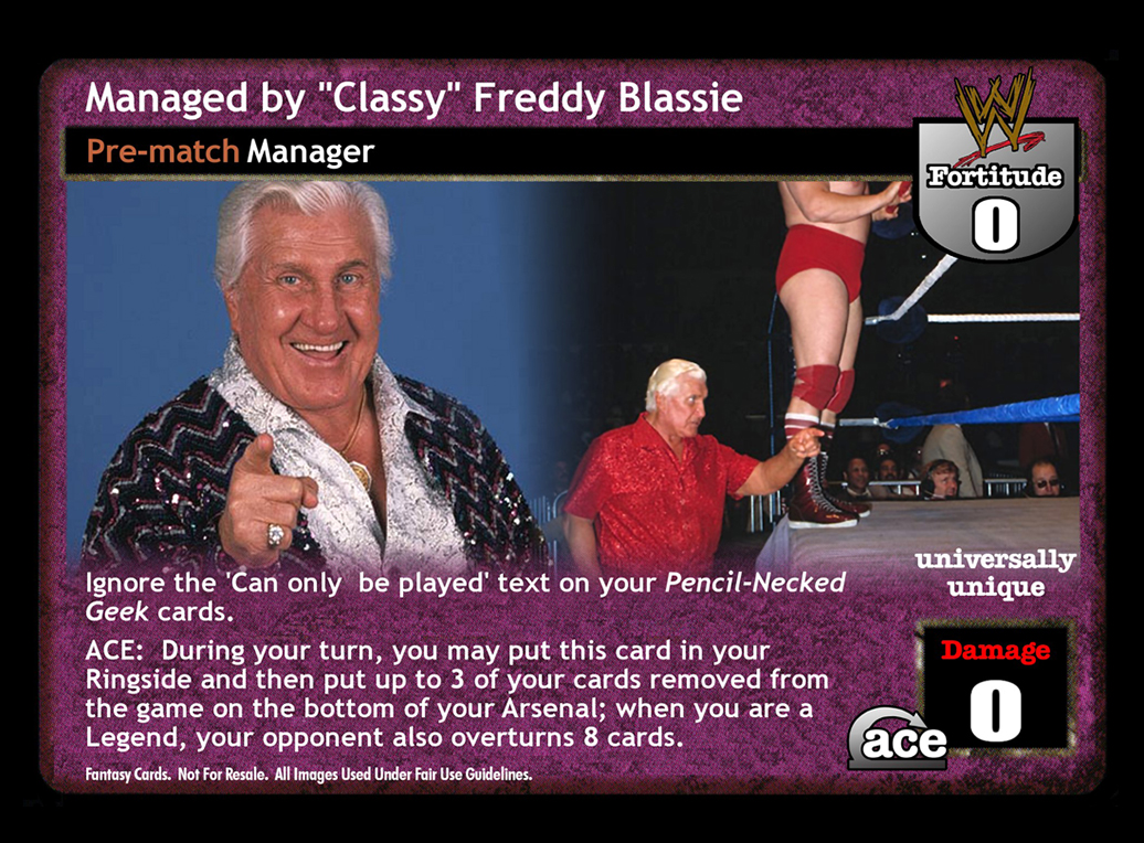 Ignore the 'Can only be played...' text on your Pencil-Necked Geek cards. ACE: During your turn, you may put this card in your Ringside and then put up to 3 of your cards removed from the game on the bottom of your Arsenal; when you are a Legend, your opponent also overturns 8 cards.