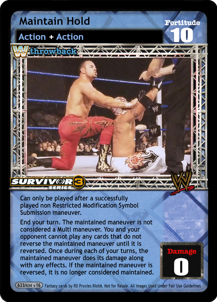Can only be played after a successfully played non-Restricted-Modification-Symbol Submission maneuver. End your turn. The maintained maneuver is not considered a Multi maneuver. You and your opponent cannot play any cards that do not reverse the maintained maneuver until it is reversed. Once during each of your turns, the maintained maneuver does its damage along with any effects. If the maintained maneuver is reversed, it is no longer considered maintained.