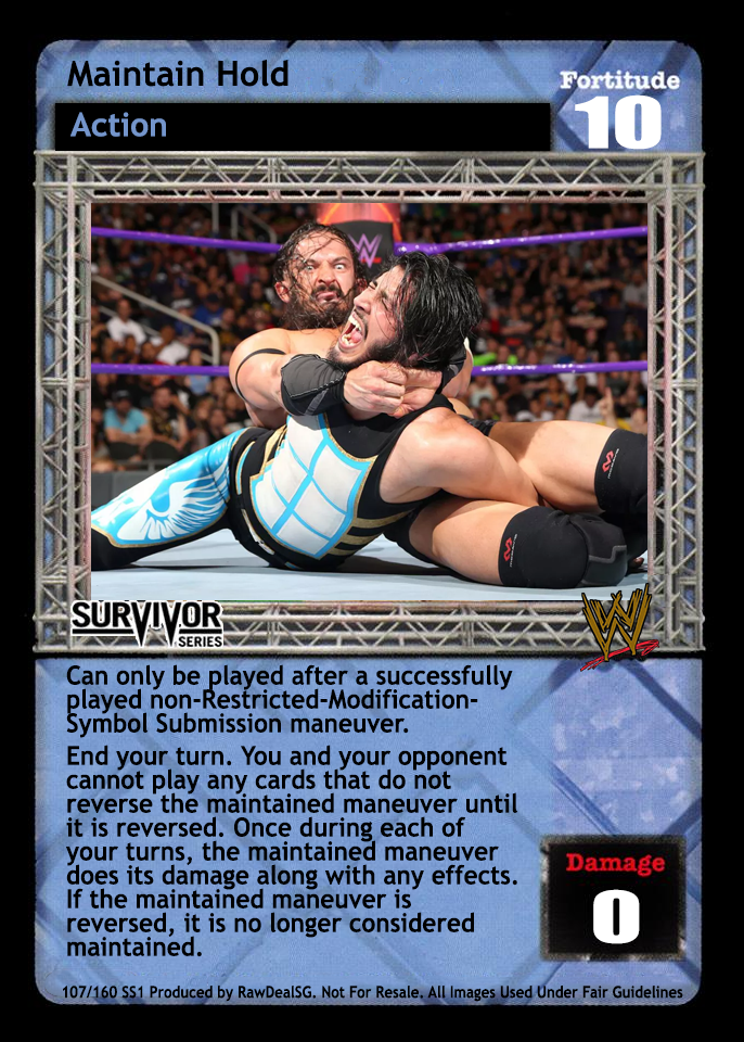 Can only be played after a successfully played non-Restricted-Modification-Symbol Submission maneuver. End your turn. You and your opponent cannot play any cards that do not reverse the maintained maneuver until it is reversed. Once during each of your turns, the maintained maneuver does its damage along with any effects. If the maintained maneuver is reversed, it is no longer considered maintained.