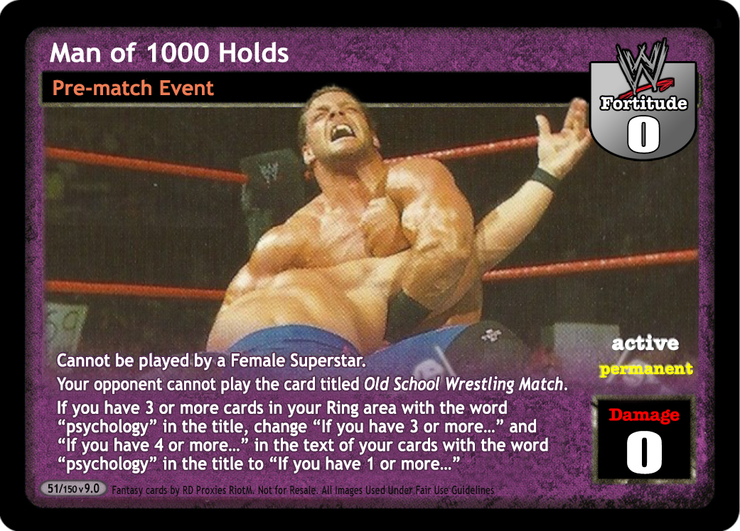 Cannot be played by a Female Superstar. Your opponent cannot play the card titled Old School Wrestling Match. If you have 3 or more cards in your Ring area with the word "psychology" in the title, change "If you have 3 or more..." and "If you have 4 or more..." in the text of your cards with the word "psychology" in the title to "If you have 1 or more..."
