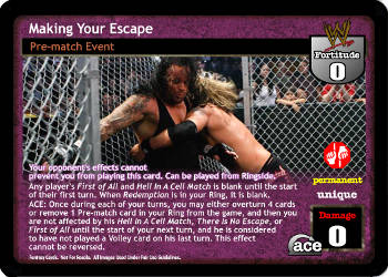Your opponent's effects cannot prevent you from playing this card. Can be played from Ringside. Any player's First of All and Hell in a Cell Match are blank until the start of their first turn. When Redemption is in your Ring, it is blank. ACE: Once during each of your turns, you may either overturn 4 cards or remove 1 Pre-match card in your Ring from the game, and then you are not affected by his Hell In A Cell Match, There Is No Escape, or First of All until the start of your next turn, and he is considered to have not played a Volley card on his last turn. This effect cannot be reversed.