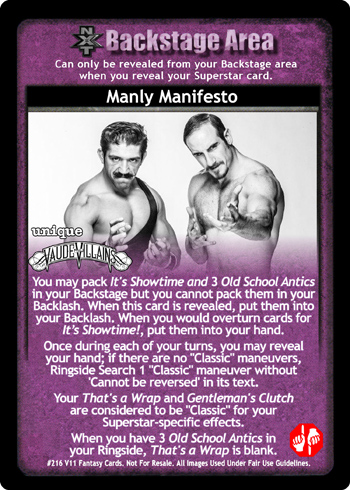 You may pack It's Showtime and 3 Old School Antics in your Backstage but you cannot pack them in your Backlash. When this card is revealed, put them into your Backlash. When you would overturn cards for Its Showtime!, put them into your hand. Once during each of your turns, you may reveal your hand; if there are no 'Classic' maneuvers, Ringside Search 1 'Classic' maneuver without 'Cannot be reversed' in its text. Your That's a Wrap and Gentleman's Clutch are considered to be 'Classic' for your Superstar-specific effects. When you have 3 Old School Antics in your Ringside, That's a Wrap is blank.