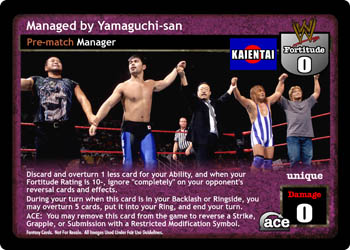 Discard and overturn 1 less card for your Ability, and when your Fortitude Rating is 10- ignore 'completely' on your opponent's reversal cards and effects. During your turn when this card is in your Backlash or Ringside, you may overturn 5 cards, put it into your Ring, and end your turn. ACE: You may remove this card from the game to reverse a Strike, Grapple, or Submission with a Restricted Modification Symbol.